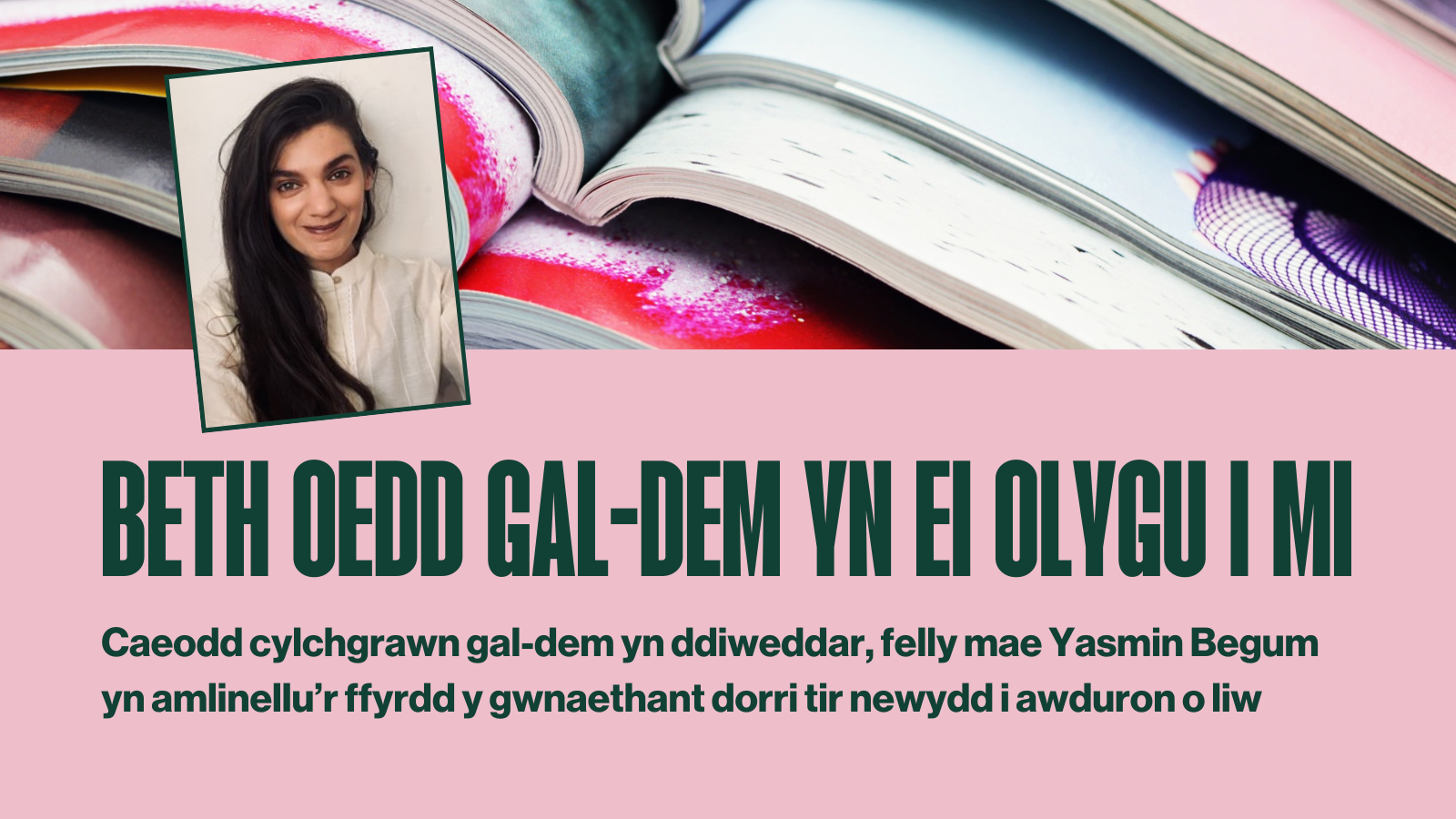 Cefais fy nghyflwyno i gal-dem yn 2015 yn ystod fy nghyfnod fel myfyriwr israddedig yn yr Ysgol Astudiaethau Dwyreiniol ac Affricanaidd, Prifysgol Llundain. Roedd ffocws unigryw’r cylchgrawn ar fenywod o liw ac unigolion anneuaidd yn torri tir newydd. Treuliais fy mhlentyndod yn ne Grangetown, Caerdydd, a ddatblygwyd gan Gorfforaeth Ailddatblygu Bae Caerdydd ac yn gysylltiedig yn hanesyddol â Bae Teigr, cartref cymuned Ddu hynaf Prydain. Roedd gan y gymdogaeth hon, a oedd yn fywiog yn y 1990au ac yn hynod amrywiol, y crynodiad uchaf o drigolion heb fod yn wyn yng Nghymru. Tra bod ieithoedd fel Somalieg, Bengaleg, a Phanjabi yn atseinio yn ein cartrefi, roedd y Gymraeg yn bwnc ysgol cyffredin. Wrth dyfu i fyny, roedd fy silff lyfrau yn cynnwys awduron fel Hazel Carby, gan fy ngwneud yn ymwybodol iawn o brinder awduron Cymreig o leiafrifoedd ethnig.